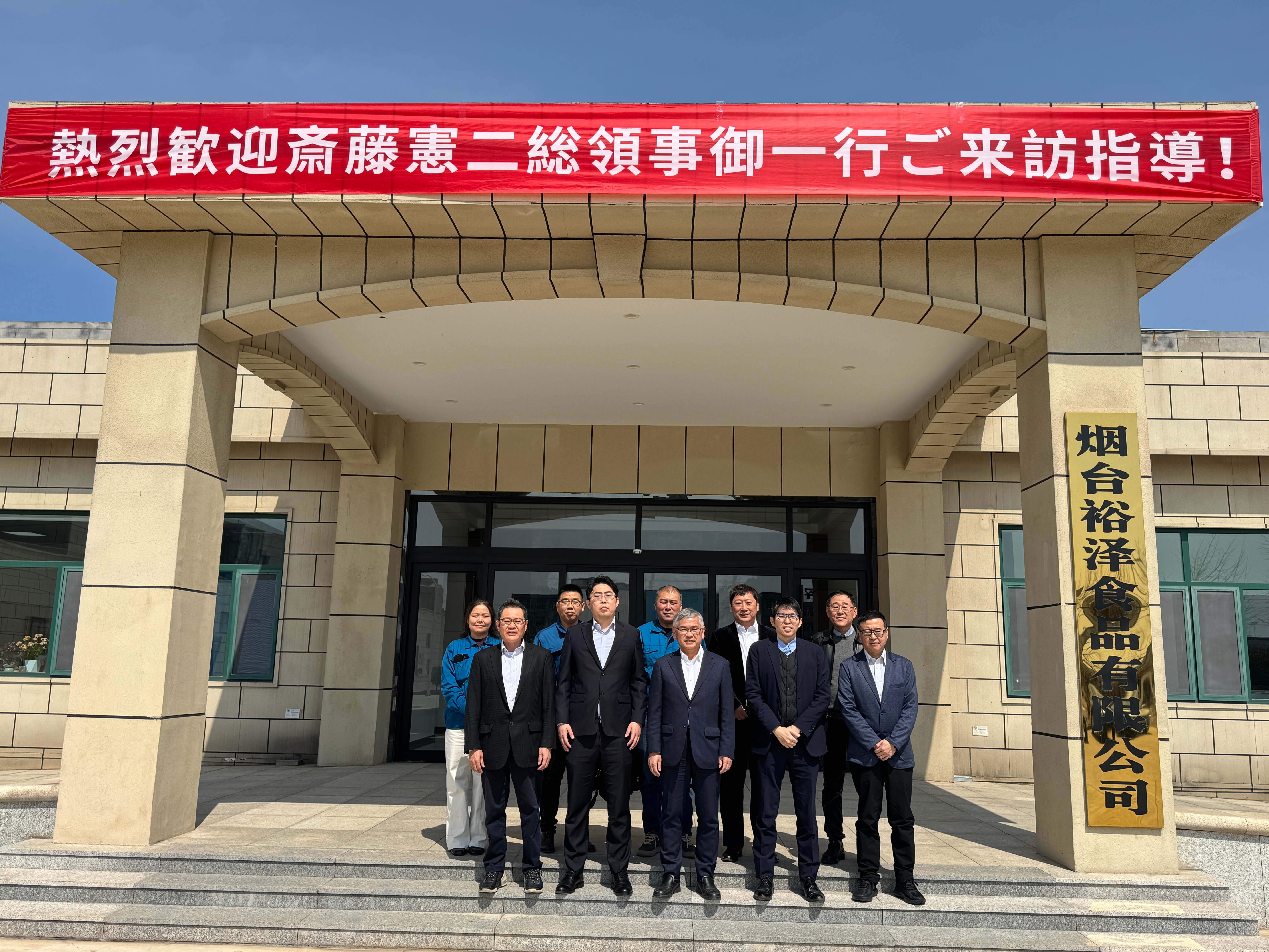 3月31日、煙台市に出張中の斎藤総領事は、極洋の協力会社である煙台裕澤食品有限公司(以下「裕澤」)を訪問しました。極洋は1937年に捕鯨会社として設立されましたが、現在は日本を代表する水産会社の一つとして広く知られています。2005年に青島極洋貿易有限公司を設立した後は、同社を通じて山東省や遼寧省を中心に約50か所の協力会社と提携しつつ、世界各地から仕入れた海産物を加工し、海外に輸出する事業を展開しています。