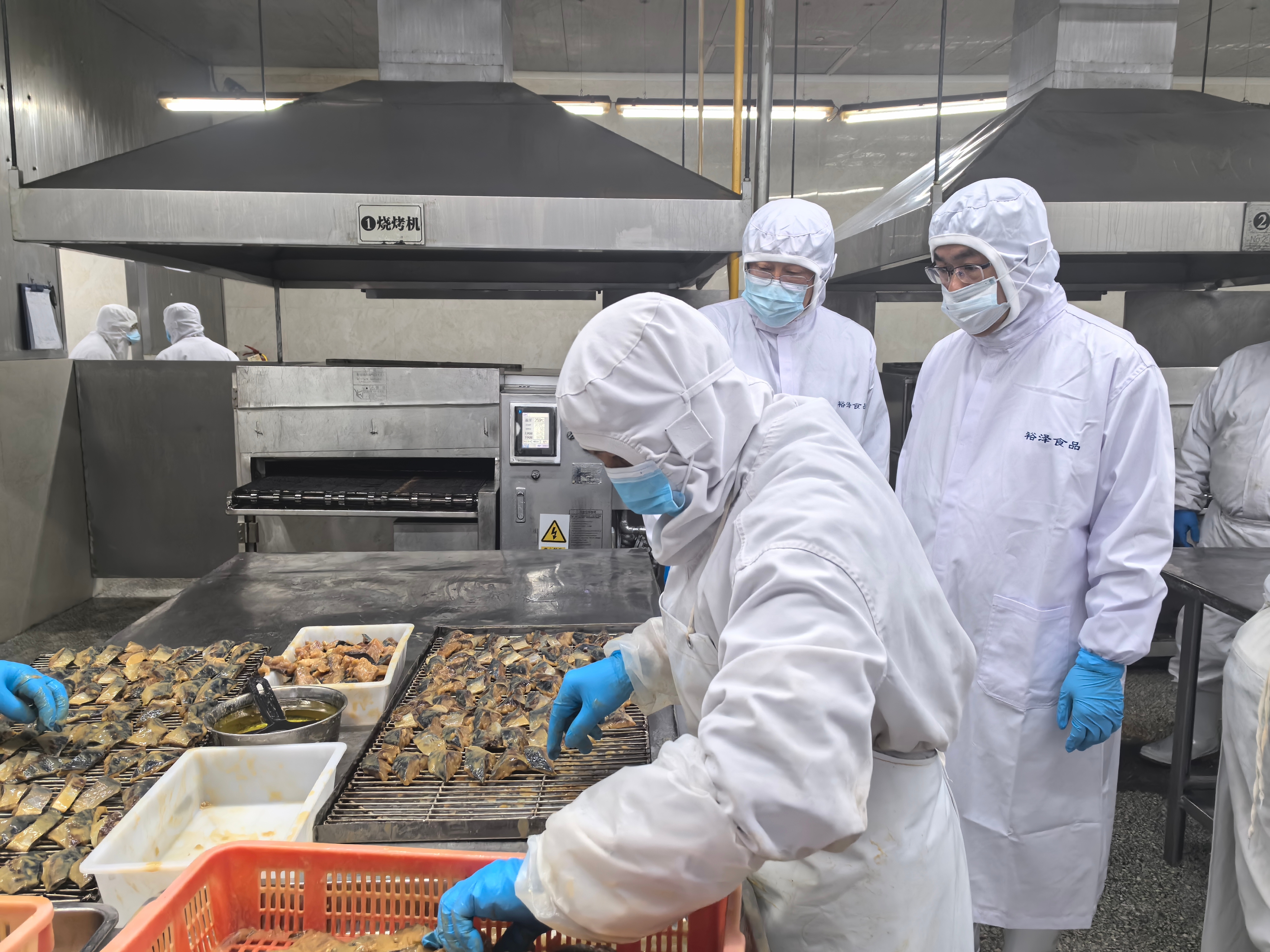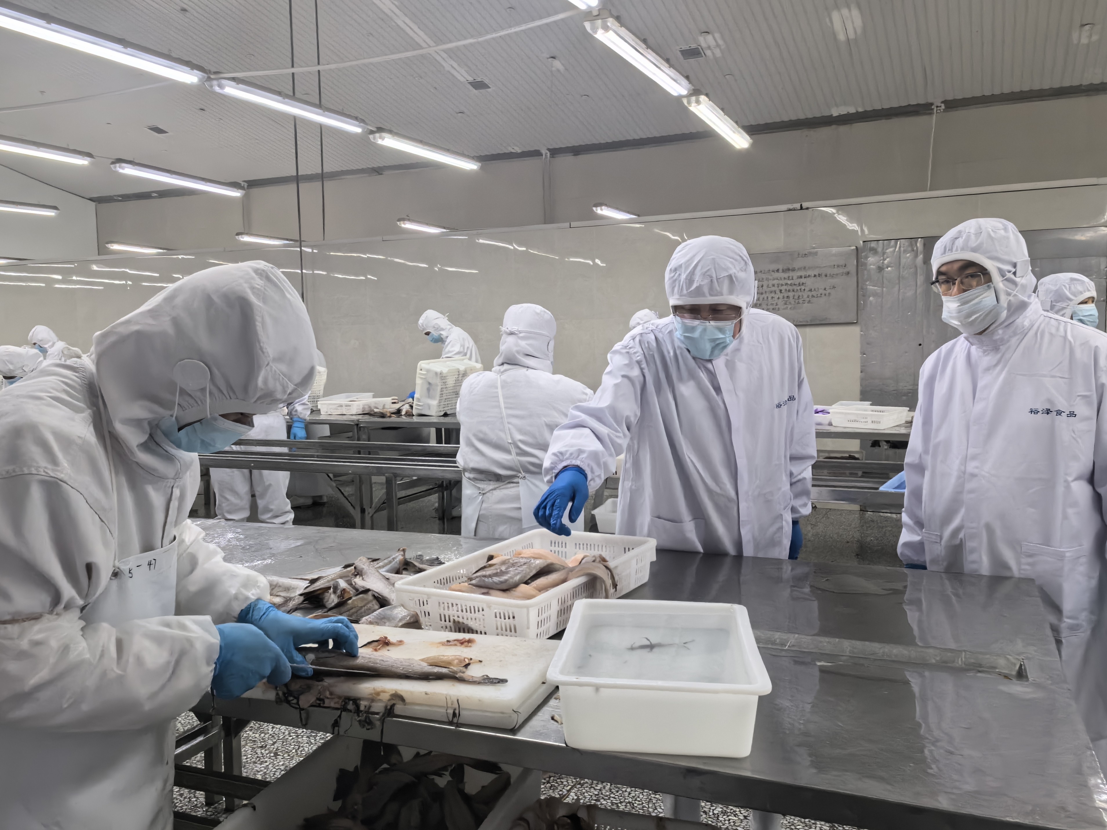 「裕澤」はそんな協力会社の一つで、極洋との付き合いは2000年に遡ります。欧米等で捕れる鱈や鮭などを切り身にし、焼き魚や煮魚に冷凍加工して業務用として輸出しています。そのうち日本向けの販売高は全体の約半分を占めるとのことです。近年は養老施設や学校給食用も増えており、骨抜きなどに関する要求レベルが高くなっているそうです。工場内では高度な衛生・品質管理に加え、工員の皆さんが挨拶を徹底していたのが印象的でした。地元雇用が多い山東省にしては珍しく、雲南省や四川省など外地出身者が多いのも特徴と言えます。