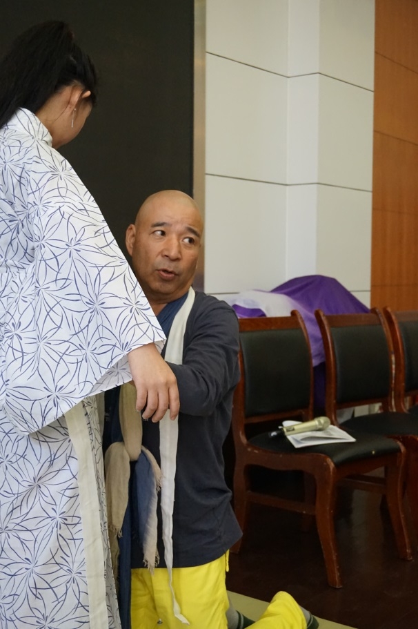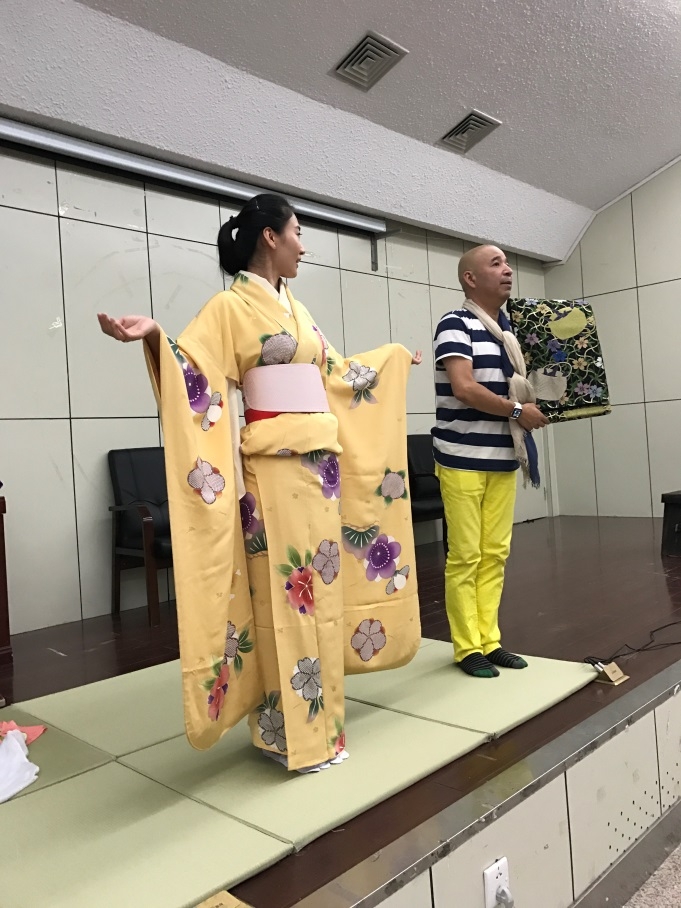 富田老师首先向学习日语、对日本文化感兴趣的观众表示感谢,现场展示了融入自山东省出发远赴日本寻找长生不老药的徐福传说元素的和服、用猪骨拉面染制而成的浴衣(夏季和服)、用巧克力、草莓染制而成的和服、为好莱坞男演员设计的和服以及电视剧中大奥(将军后宫)中将军正室夫人角色所用的打卦等。展示的同时还会邀请几位现场观众进行试穿。