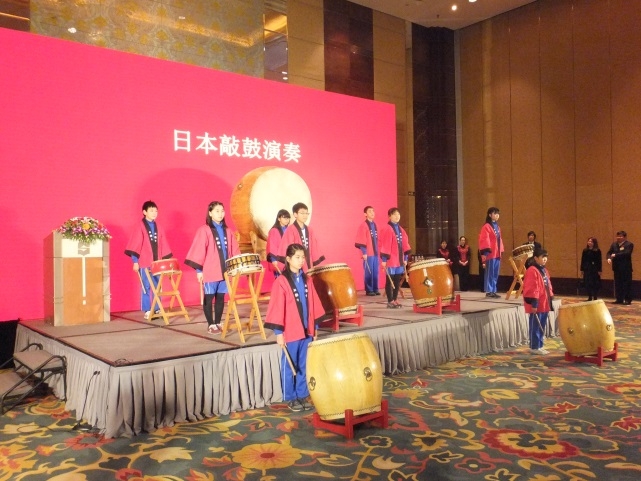 招待会开幕式上,远山总领事致辞后,陈副主任代表山东省政府致辞。青岛日本人学校6年级学生带来的极具震撼力的和太鼓表演,将会场的气氛推向了高潮。能势会长致祝酒词后,到场嘉宾自由交流畅谈。本次干杯用酒使用的自日本进口的日本酒,会场上除了设有各品牌日本酒的介绍及品鉴区,还向中国友人分发了日本产大米。